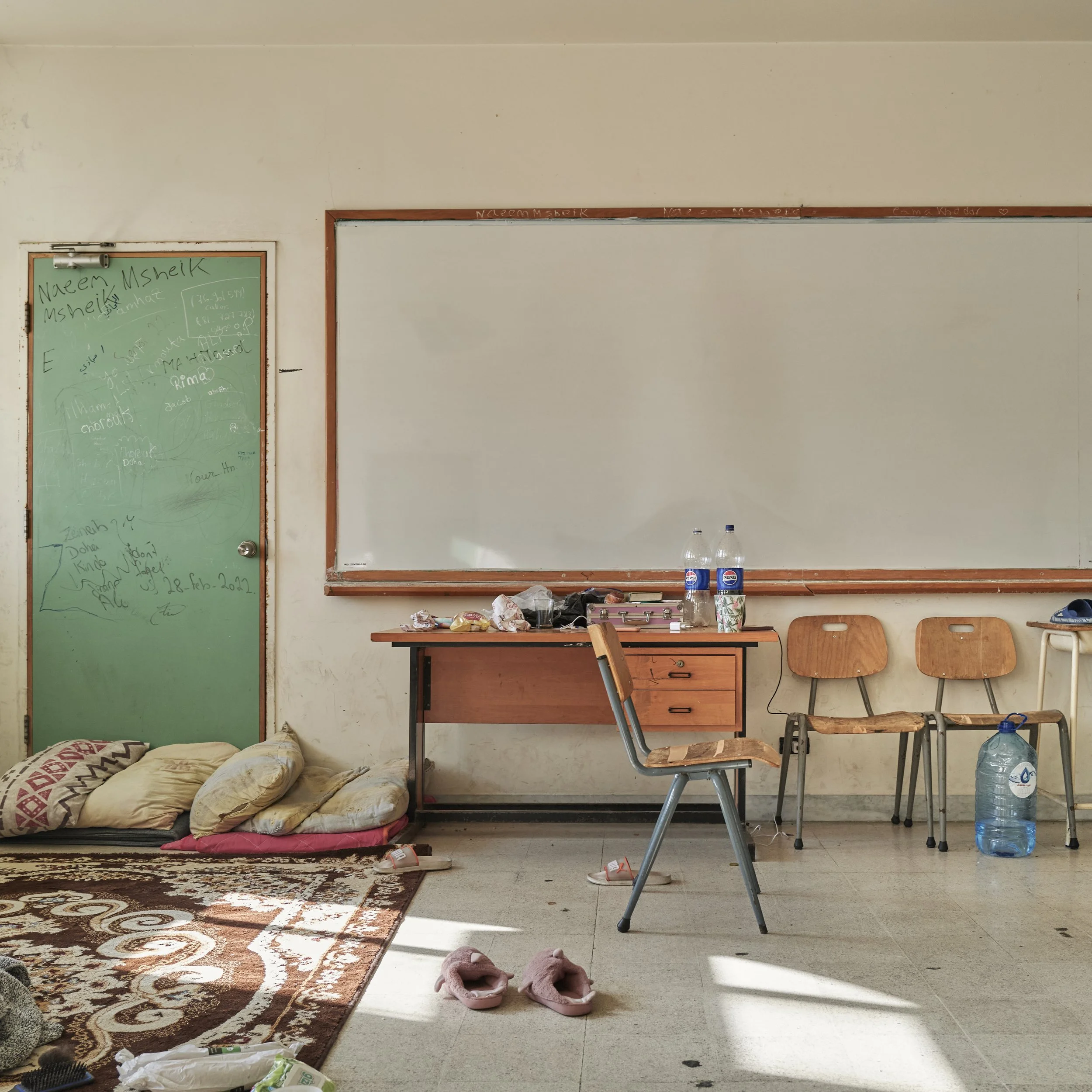 With the outbreak of war in Lebanon, thousands of civilians, particularly from the south of the country, were forced to abandon their homes and lives, seeking refuge in safest area. Schools, places of learning, were transformed into emergency shelters for those fleeing the conflict. Desks became dining tables, and beds were set up beneath blackboards—spaces for living, but also for hope, in a context that completely disrupted educational paths.